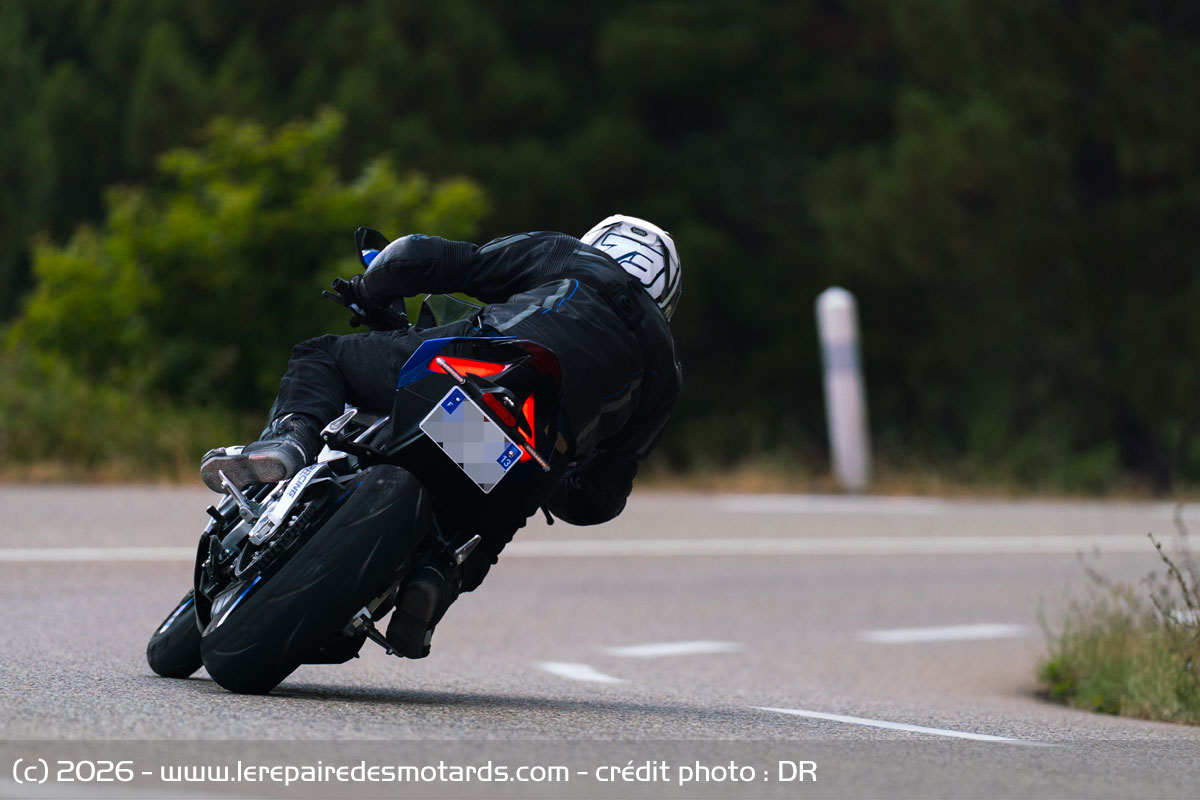 Au moins, avec 95 ch « seulement » à gérer, ces gommes également prévues pour les hypersportives tiennent, « grippent », chauffent assez rapidement et semblent adopter un profil vif, mais compatible avec une utilisation sur route, offrant une mise sur l’angle progressive et aisée, ainsi qu’une belle stabilité. Les repose-pieds ont en tout cas du mal à aller chercher le sol et l’on ne s’en plaindra pas. Le pneu de 180 à l’arrière apporte motricité tout en renforçant la précision de l’inscription sur l’angle. Dans cet environnement imprévisible par nature qu’est la route, on profite une fois encore d’un excellent travail des suspensions au niveau filtration, semblant certes sportives (fermes) dans leur définition de réglage, mais aussi confortables que possible, surtout avec une selle résolument dure pour mon délicat séant. Quelques passages sur des bosses encouragent à assouplir la compression, notamment sur le mono amortisseur, pour gommer au lieu de jouer au cabri : l’arrière demeure vif ! La 703 RR est une moto rigide entre les jambes qui le fait savoir et elle encourage à jouer du placement de son corps pour être la plus efficace possible. Sur départementale, on appréciera de pouvoir se décontracter au guidon en profitant de la légèreté ressentie une nouvelle fois au guidon, tout en conservant un sentiment de stabilité et de sécurité. Il est ainsi possible d’adopter un style fluide et roadsterisant.