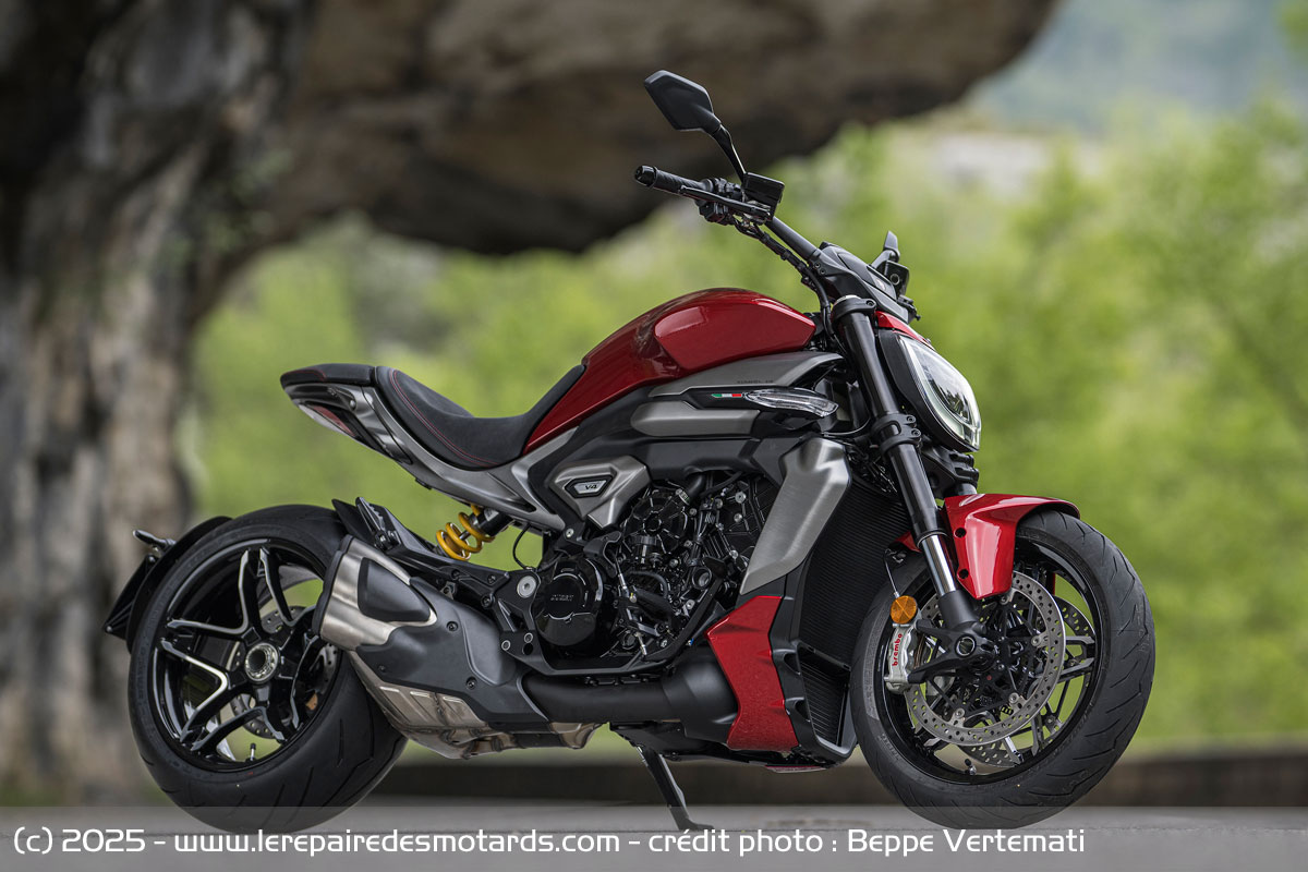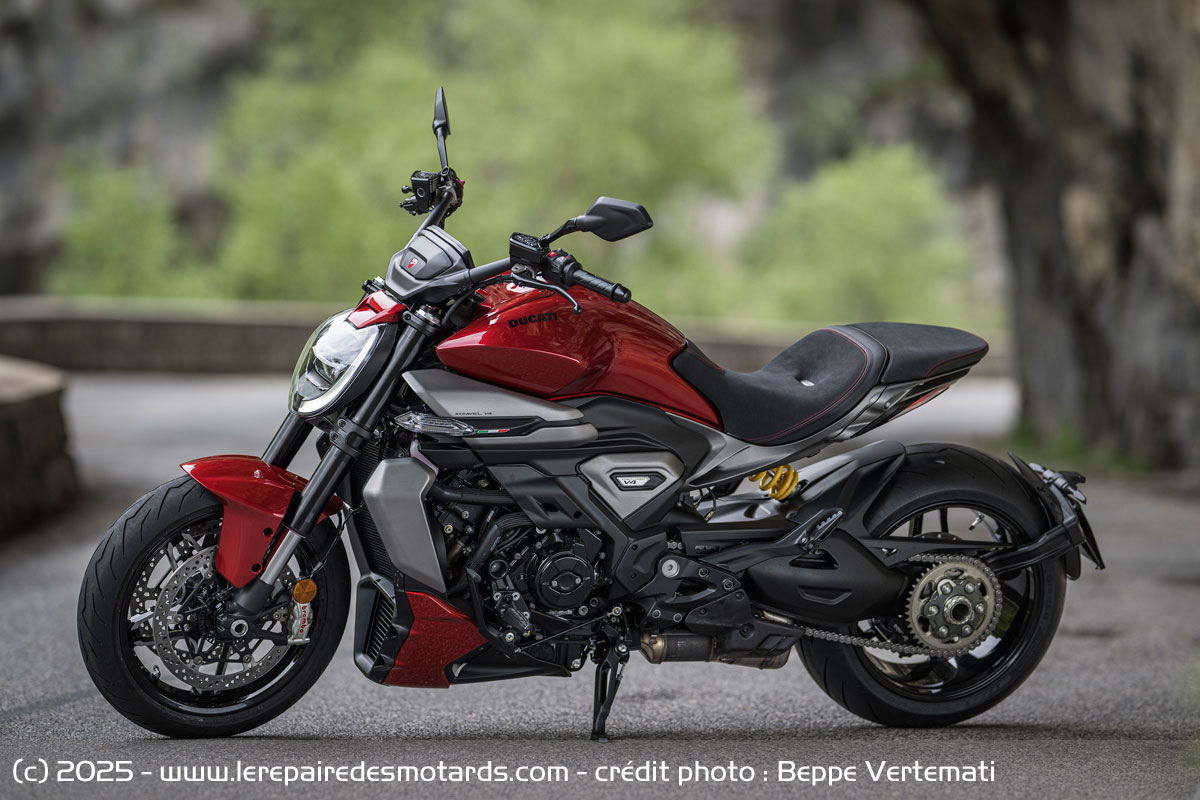 Visuellement plus compacte, mais paradoxalement plus massive, cette nouvelle version s’est allégée de 6 kg. La finition progresse également, grâce à des clignotants à LED intégrés et une signature lumineuse modernisée, avec un phare avant redessiné et un feu arrière toujours aussi distinctif. L’arrière, plus allongé, apporte un surcroît de confort au passager, même si cela atténue légèrement le dynamisme perçu. En revanche, certains détails déçoivent : câbles apparents, catalyseur peu élégant, repose-pieds passager simplistes. Autant d’éléments qui tranchent avec l’exigence habituelle de Ducati et qui laissent à certaines concurrentes, comme la Triumph Rocket III, un avantage en matière de finition.