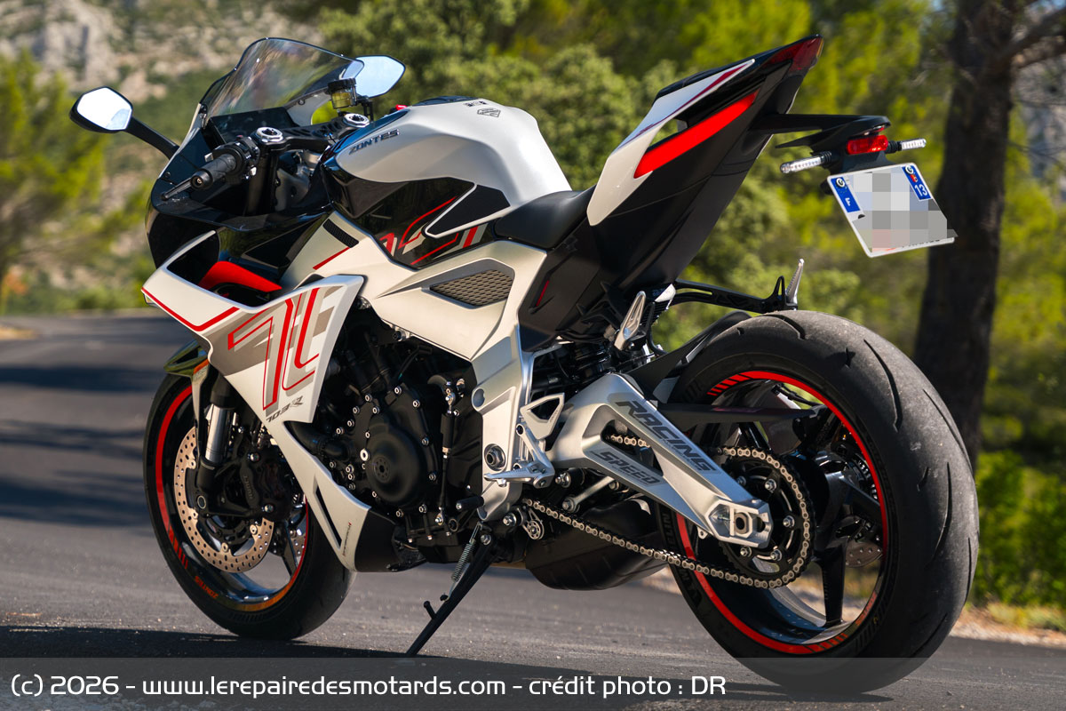 Ces derniers mois, deux modèles ont retenu l'attention : la CFMoto 675 SR-R et la Zontes 703 RR, toutes deux importées par GD France et toutes deux équipées d'un moteur trois cylindres, une architecture peu commune dans ce segment, qui évoque la Triumph Daytona ou la MV Agusta F3. La Zontes 703 RR se distingue en particulier par des choix techniques qui la placent au-dessus de la moyenne des productions chinoises actuelles.